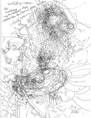 figures and structures appear without narrative intention, but may suggest relationships, tensions, or familiar echoes.