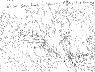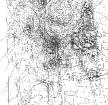 Figures and structures appear without narrative intention, but may suggest relationships, tensions, or familiar echoes.